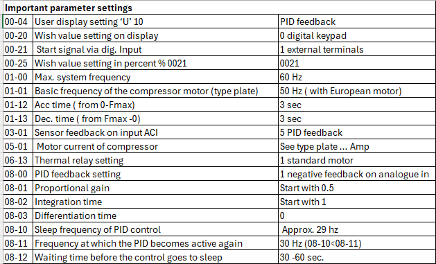 Furthermore, the PID operation must be activated.(08-00) For a compressor, you want the speed to increase if the feedback value is lower than the setpoint ( negative feedback) and the value comes in via the analogue input so setting 1