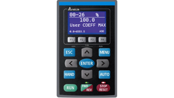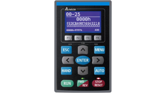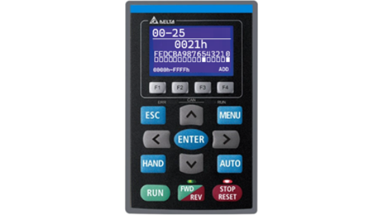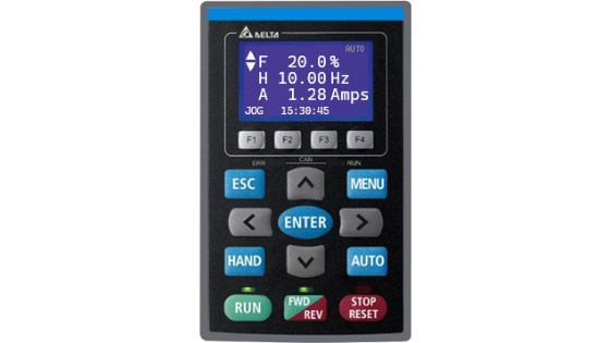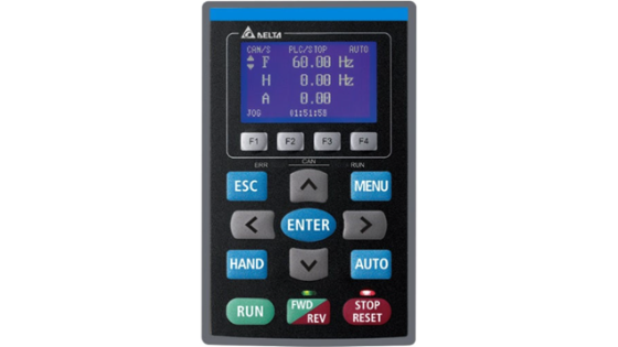 Op het display van het C2000 keypad zijn een aantal variabelen zichtbaar, standaard ingesteld zoals hieronder [F] gewenste frequentie, [H] uitgestuurde frequentie en [A] Ampères .