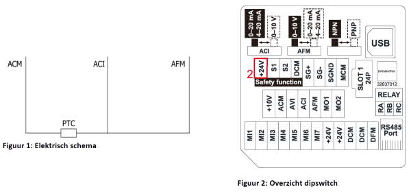 De ACI ingang moet worden ingesteld als PTC ingang. Als de waarde van deze ingang boven parameter 06-30 komt, schakelt de motor af. Of de motor afschakelt is afhankelijk van parameter 06-29.