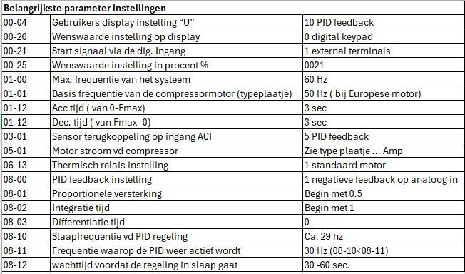 - Activeer de PID werking (08-00). Bij een compressor wil je dat het toerental toeneemt als de teruggekoppelde waarde lager is dan de wenswaarde ( negatieve Feedback) en de waarde komt binnen via de analoge ingang dus instelling 1.