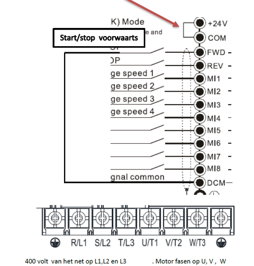 2. Aansluiten start/stop signaal op FWD en DCM . brug van +24 V naar Com.
